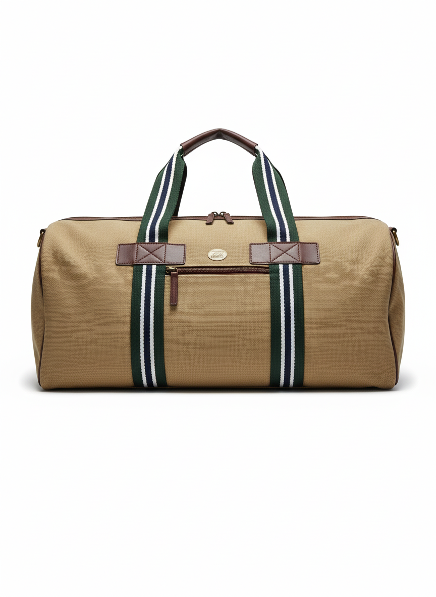 At first glance, it carries the familiarity of a classic weekender - a warm sand-toned canvas body, grounded by deep striped handles that run through the bag. Structured enough to hold its shape, without feeling rigid.